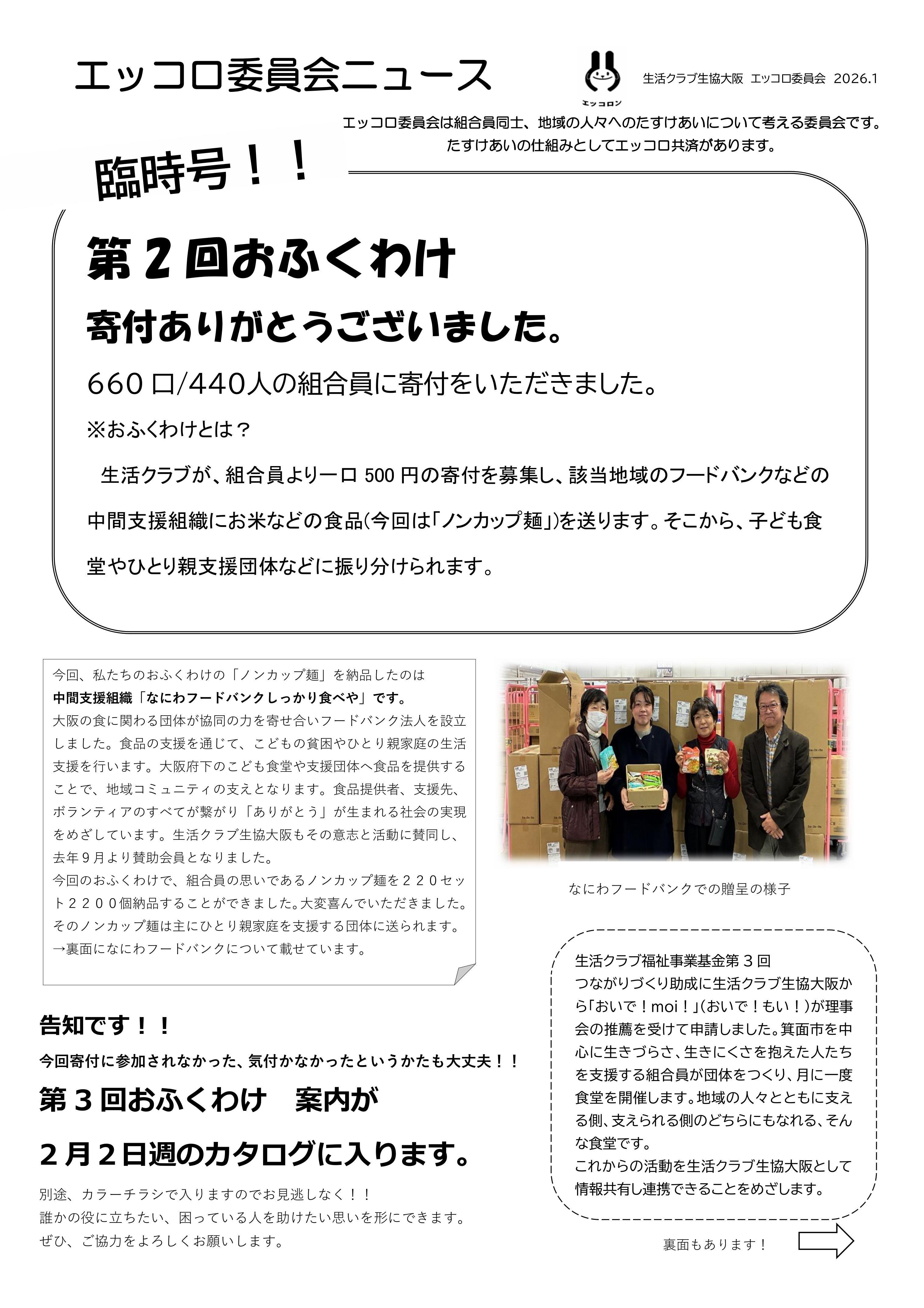 エッコロ委員会ニュース臨時号 第2回おふくわけの寄付ありがとうございました。次回案内は2/2週です。