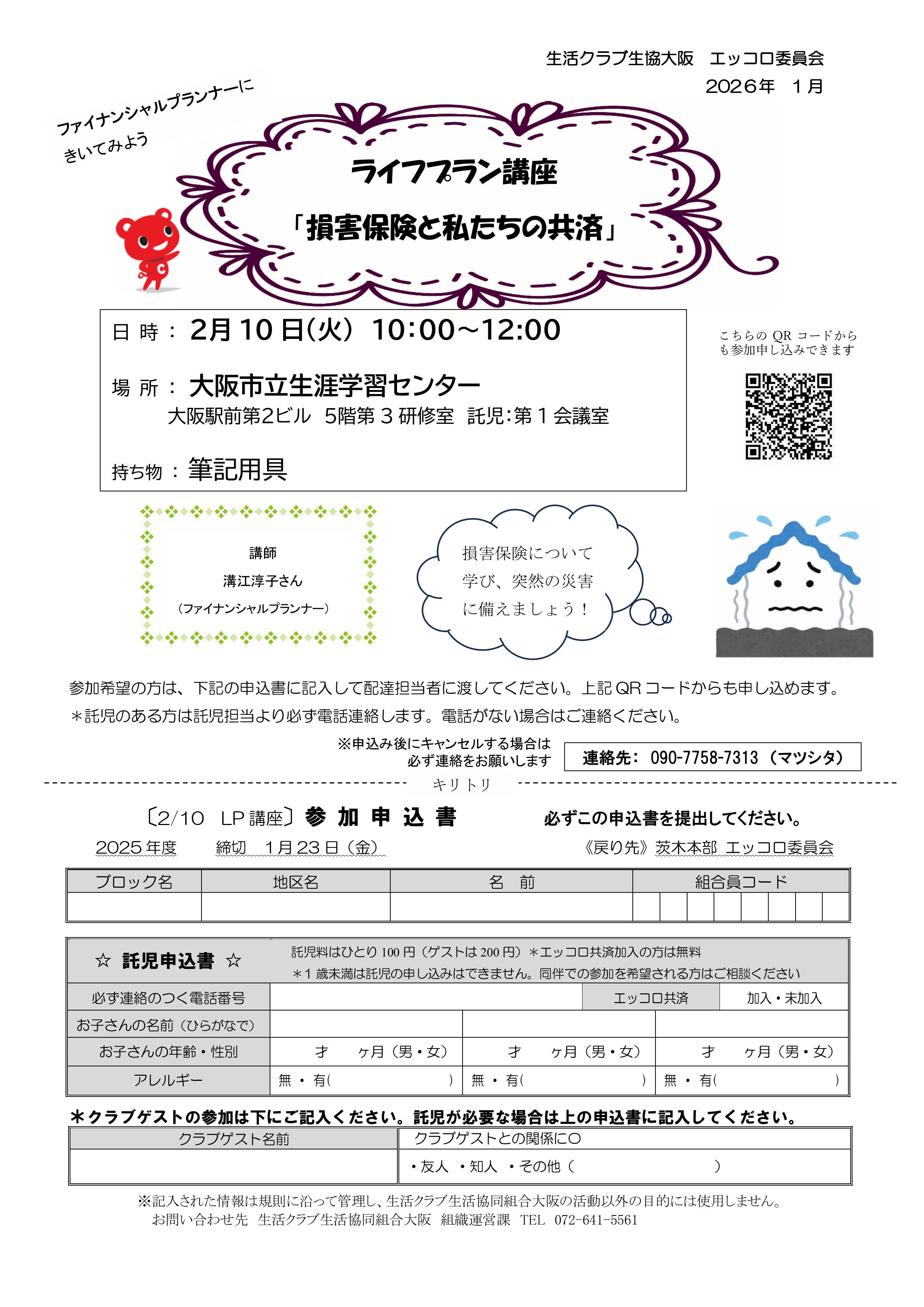 1/23〆切【2/10開催】ライフプラン講座「損害保険と私たちの共済」